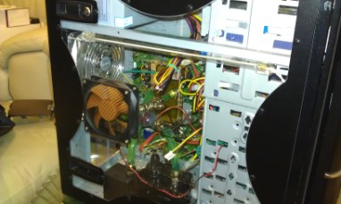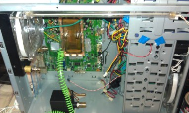 Just a close up of what's going on inside the console. I have also wired up the DVD drive to the motherboard up. The original cables are about 3" in size so obviously that could not reach the top when inserted so I inserted a normal length sata cable from the mobo to the DVD drive and extended the power cable. Extending the power cable took an awful amount of time as each wire had to go to its right wire on the other side or else we would be having some serious problems.