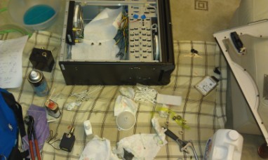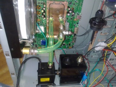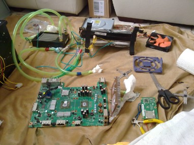 Here you can see the Xbox 360 motherboard exposed and bits all over the place. The water block that is place on the right of the Xbox 360 motherboard has some thermal paste stuck on to it which I will have to remove and replace to ensure near perfect heat conductivity between the chip sets and the copper water block!